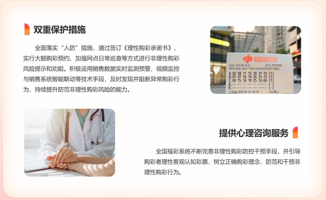 “理性购彩,量力而行”是福彩始终坚持的购彩理念。全国福彩系统积极开展非理性购彩研究,完善非理性购彩防治理论支撑,综合运用“人防+技防”手段,不断提升非理性购彩行为防范能力,健全干预措施,保障购彩者切身利益。