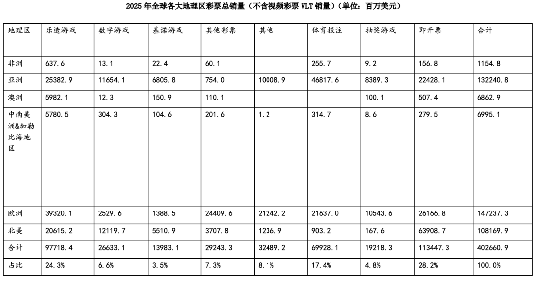 2025年,全球被动型抽奖游戏(即国内俗称的传统票)总销量约为192亿美元,约占全球彩票总销量的4.8%,相比2024年的180亿美元增长19.2%,增长幅度在各类游戏中是最高的。