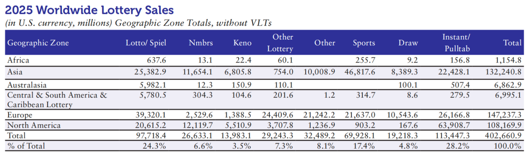 近日,美国《拉弗》杂志公布了2025年全球彩票销量报告。2025年全球彩票总销量(不含视频彩票VLT销量)达到4027亿美元,相比2024年的3844亿美元增长4.8%。