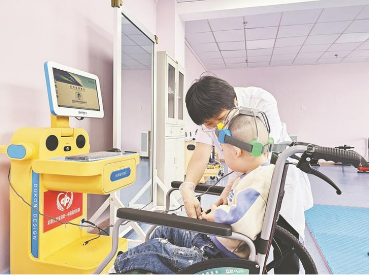 黄石市儿童福利院康复师利用经颅磁刺激仪为儿童做康复治疗。