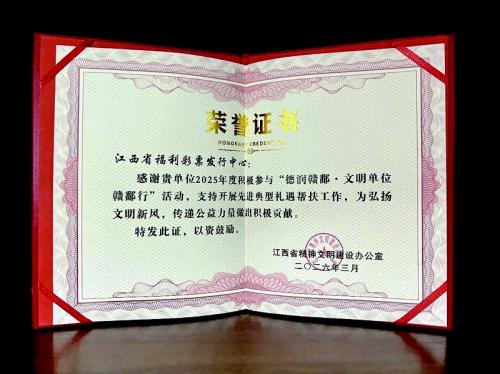 一份荣誉,一份责任;一程耕耘,一路芬芳。江西福彩所获的荣誉,是过往公益之路的总结,更是未来前行的动力。2026年,江西福彩将继续秉承国家公益彩票的使命,计划使用福彩公益金对96名道德模范、身边好人、时代楷模等榜样人物进行公益慰问,以公益资助、彩票宣讲、公益展示等更多样化、接地气的公益活动形式,持续深化对身边好人的礼遇与帮扶,让送文明、送服务、送关怀的行动常态化、长效化,推动好人精神在江西大地深入人心,为全省精神文明建设持续注入公益动能。(通讯员 孔佳乐)